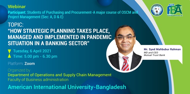 The Department of Operations and Supply Chain Management (OSCM), AIUB organized a webinar on “How Strategic Planning Takes Place, is Managed and Implemented in Pandemic Situation in Banking Sector” on April 06, 2021 from 05.00 pm to 06.30 pm. The target audience of the webinar was students of Purchasing and Procurement: a major course of OSCM and students of Project Management (Section A, D and E). The guest speaker of the webinar was Mr. Syed Mahbubur Rahman, CEO and Managing Director of Mutual Trust Bank Ltd (MTB).
