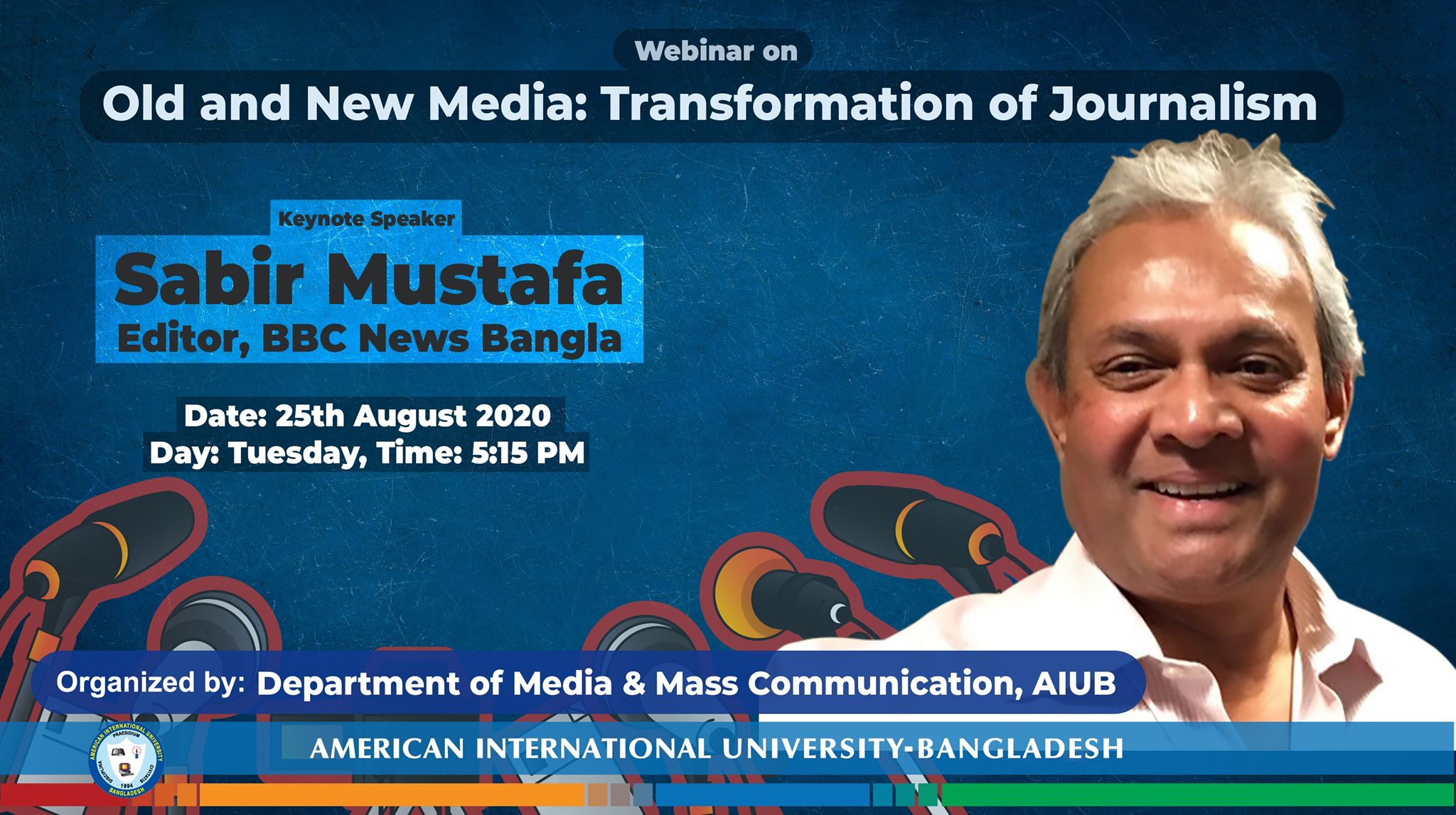 The Department of Media and Mass Communication, AIUB organized a webinar on ‘Old and New Media: Transformation of Journalism’ on 25th August 2020, Tuesday at 5:30 pm. Sabir Mustafa, Editor, BBC News Bangla, addressed the audience as the keynote speaker.