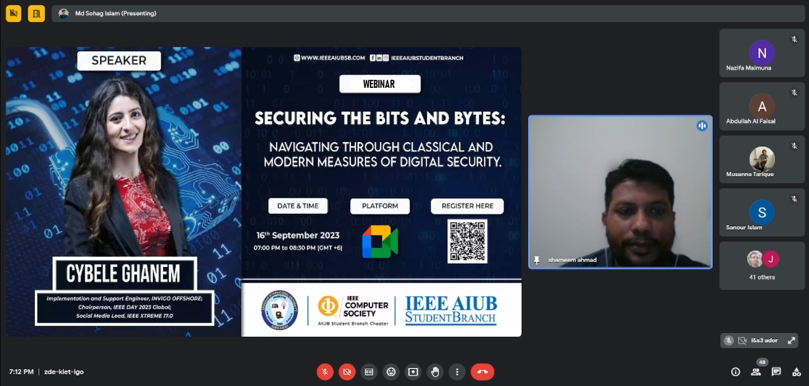 On Saturday, 16th September 2023, IEEE AIUB Student Branch, in collaboration with the IEEE Computer Society AIUB SB Chapter, successfully hosted a webinar titled “Securing the Bits and Bytes: Navigating through Classical and Modern Measures of Digital Security”. The event was held with the purpose of providing some context on cryptography and computer security and developing its knowledge among the participants. It highlighted the significance and the need for cryptography and computer security in the modern era. The session also emphasized the importance of advancements in digital security technologies and infrastructure, ultimately in alignment with SDG 9 (industry, innovation, and infrastructure).