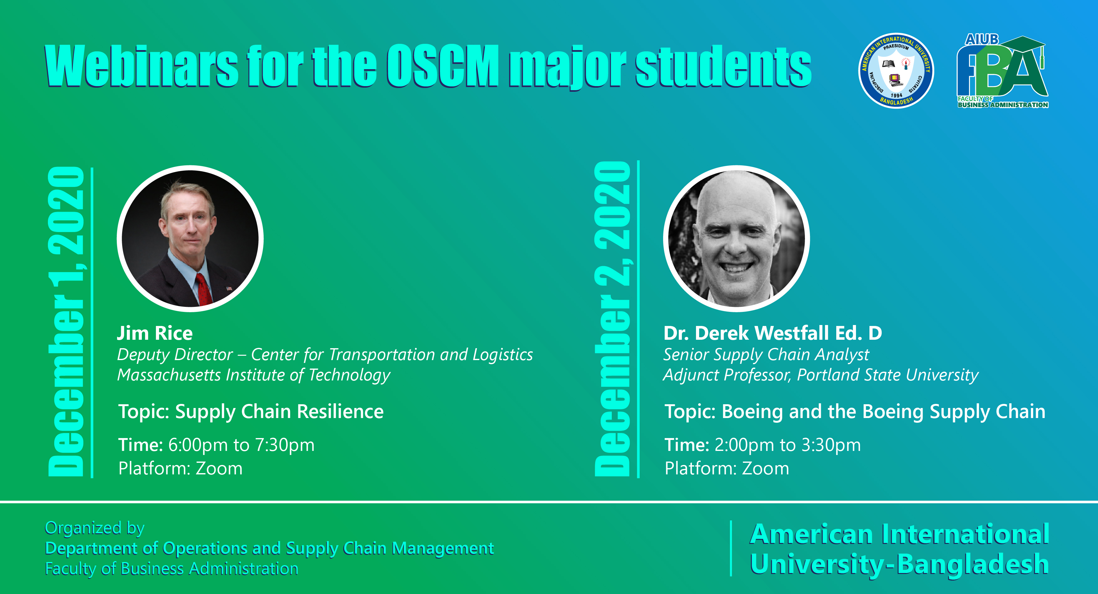 The Department of Operations and Supply Chain Management (OSCM), Faculty of Business Administration organized two webinars on Tuesday, 1 December and on Wednesday, 2 December 2020. The first webinar on “Supply Chain Resilience” was held on Tuesday, 1 December 2020 from 6:00 PM to 7:30 PM for the OSCM major students and faculty members. The resource speaker, Mr. Jim Rice, Deputy Director, Center for Transportation and Logistics (CTL) and Director, Supply Chain Exchange Program, Massachusetts Institute of Technology (MIT), USA spoke on the basics of supply chain resilience, supply chain risk management vs. supply chain resilience and some solutions-resilience aspects expected in the future. The second webinar was titled “Boeing and the Boeing Supply Chain” and was held on Wednesday, 2 December 2020 at 2:00 PM with the resource speaker Dr. Derek Westfall, Senior Supply Chain Analyst, Adjunct Professor, Portland State University, USA. He discussed on how Boeing, Airbus and the Airline Industry conduct operations in their supply chain. Both webinars were very insightful and addressed contemporary issues of Supply Chain Management.