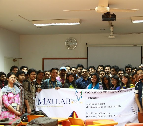 Engineering Student's Association of Bangladesh (ESAB) AIUB Unit Face organized an informative workshop entitled as "Workshop on basic concepts of MATLAB" at Room-266, Building-2, Faculty of Engineering, AIUB from 2:00 pm – 5:00 pm on 25th March, 2015. MATLAB (Matrix Laboratory) is a numerical computation environment and a fourth generation programming language developed by MathWorks. MATLAB is widely used in academic and research institutions as well as industrial enterprises. Thus in the Engineering sectors like Electrical and Electronic Engineering, it is highly likely to have the knowledge of the basic concepts of MATLAB. The seminar started with the national anthem, followed by a brief promo video, focusing on ESAB's mission, vision and activities. Dr. A.B.M Siddique Hossain (Professor and Dean, Faculty of Engineering, AIUB) delivered the inaugural speech by emphasizing on the applications of MATLAB in today’s world. Mr. Rinku Basak (Head, Graduate Program, Department of EEE, AIUB) provided an informative speech and briefly discussed about the technical computing process and inner mechanism of MATLAB and the necessity of it in the future world. Later on, Mr. Mashrur H. Shurid (Development and Planning Secretary, ESAB) gave away an inspirational speech. The first session of the workshop started with speaker Ms. Tajbia Karim (Lecturer, Department of EEE, AIUB). She started the session by introducing MATLAB to the participants. She discussed about the basic syntax, general arithmetic and logical operation, plot specification and a variety of other basic necessities for the beginner. She also described matrix formation and manipulation and constructing functions using MATLAB. The second session was conducted by Ms. Tasnuva Tasneem (Lecturer, Department of EEE, AIUB), where she shared her in-depth knowledge about MATLAB. She shared her expertise on basic and advanced functions regarding image processing and briefly described the theory behind the formation of matrices in terms of image processing. The final session began with Ms. Tajbia Karim’s demonstration of “Basic implementation of filter”. She emphasized on using an efficient filter mechanism which was in this case a Band Pass filter. The session ended with a hands-on practical application of voice filter. Input voice signal from an audience was filtered using a Butterworth filter designed by Ms. Tajbia with MATLAB functions which received a great round of applause. Noise cancellation mechanism was briefly discussed and she encouraged the participants to try and design their own version of filter. At the end of the workshop session, Dr. Md. Abdul Mannan (Associate Professor & Head, Undergraduate Program, Department of EEE, AIUB) delivered a speech emphasizing on programming in today’s world. He also emphasized that to serve the nation with technology; engineering students need to learn programming. The workshop was also graced by the presence of Mr. Chowdhury Akram Hossain (Assistant Professor, Department of EEE & Special Assistant, OSA), Mr. Nafiz Ahmed Chisty (Assistant Professor & Special Assistant, Department of EEE, AIUB), Mr. Md. Saniat Rahman Zishan (Assistant Professor, Department of EEE & Special Assistant, OSA), Mr. Shahriar Hasan Shehab (Lecturer, Department of EEE, AIUB), Mr. Tawsif Ibne Alam (Lecturer, Department of EEE, AIUB), Ms. Shahreen Hassan (Lecturer, Department of EEE, AIUB), Ms. Sadiya Yasmin(Lecturer, Department of EEE, AIUB), and Ms. Sumaiya Umme Hani (Lecturer, Department of EEE, AIUB). At the end of the ceremony, in the presence of Dr. Md. Abdul Mannan and Mr. Md. Saniat Rahman Zishan certificates and souvenirs were handed to the speakers as a token of appreciation. Certificates were also distributed among the participants for their successful participation to the event by the honorable speakers.