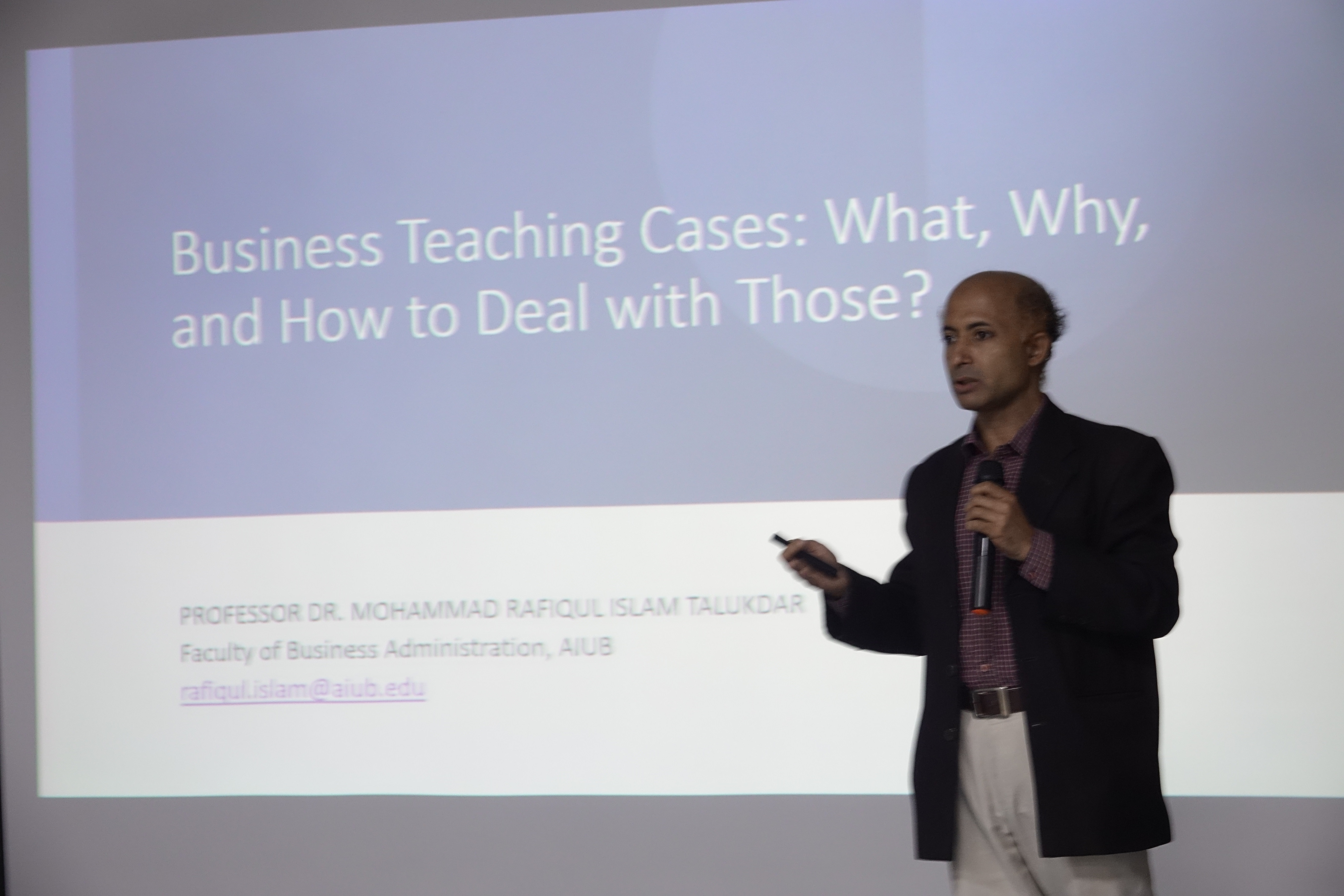 The Faculty of Business Administration (FBA) and HR office of AIUB, organized a workshop on Case-based Pedagogy titled “Business Teaching Cases: What, Why, and How to Deal with Those?” on April 7, 2022, Thursday from 1:30 to 3:30 PM. The Facilitator of this session was Dr. Mohammad Rafiqul Islam Talukdar, Professor, Department of Management & HRM, FBA, AIUB. Dr. Nisar Ahmed, Director MBA Program mentioned about the purpose of the workshop and Dr. Farheen Hassan, Director BBA Program addressed the attendees what is Business Teaching Case and its importance on imparting knowledge, Skill and attitude development. All the faculty members of FBA, AIUB took part in the workshop. Vote of Thanks was delivered by Dr. Faruque Hossain, Professor, Department of OSCM, FBA, AIUB. The workshop deems to be effective in achieving its major objectives because of the keynote speaker's inclusive discussion on the said topic and the faculty members' active participation. FBA faculty members have showed a substantial interest in the special book of teaching cases to be published by FBA.