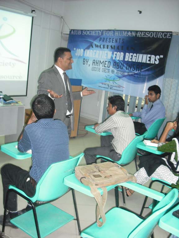 AIUB Society for HR had organized a workshop on “Job Interview for Beginners” on December 5, 2011 in Campus 1. The guest speaker was Mr. Ahmad Abu Insaf (Executive Director, MGH Restaurants Pvt. Ltd.)