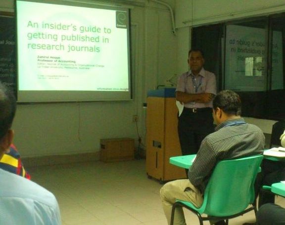A workshop titled ‘Publication in International Journals: An Insider’s View’ was organized by the Department of Accounting under two different sessions, the first session held on March 13 and the second one on March 27. The workshop was conducted by Professor Dr. Zahirul Hoque. The resource speaker is the editor of Journal of Accounting & Organizational Changes. He is also member of editorial boards of several other international journals like, Accounting, Auditing and Accountability and The British Accounting Review. Dr. Hoque is a professor of La Trobe University, Melbourne, Australia. He is also the Executive Director of Center for Public Sector Governance, Accountability and Performance of La Trobe University. The workshop covered different aspects related to publishing in reputed international journals. Dr. Hoque has shared his practical experiences with the participants both as a researcher and more importantly as the editor of international journals. His lively, enthusiastic, inspiring and interactive presentation made the sessions a very productive one. The seminar was very informative and helpful for the participants to understand how to produce good articles and publish in international journals. Participation of faculty members from all the departments of business made both the sessions of the workshop productive. The workshop was arranged by Mr. Farooque Hossain, Assistant Professor, Department of Accounting and the workshop ended with a vote of thanks by Mr. Md. Zakaria Masud, Head, Department of Accounting.