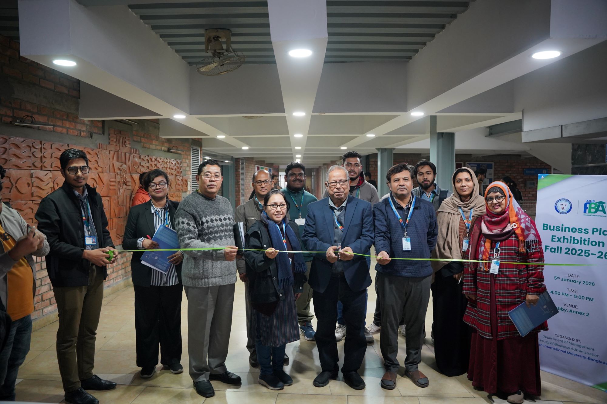 On Monday, January 05, 2026, from 4:00 to 5:30pm, the "Business Plan Exhibition Fall 2025-26" was held at the Lobby of Annex 2 by the Department of Management of the Faculty of Business Administration. The exhibition was officially inaugurated by Prof. Dr. Anwar Hossain, adviser and dean-in-charge of the Faculty of Business Administration at American International University-Bangladesh. Attendees at the exhibition's inauguration included BBA program director Dr. Rezbin Nahar, MBA program director Dr. Mohammad Faridul Alam, and Department Head of Finance Mrs. Bohi Shajahan. The event's mission includes not only providing excellent educational opportunities, but also advancing the SDGs related to industry, innovation, and infrastructure. Groups of students in the Entrepreneurship Development course showcase their most creative and practical firm ideas at an exhibition held once a semester by the management department of the Faculty of Business Administration. Dr. Md. Faruque Hossain, Professor, Department of Operations and Supply Chain Management, Soumendra Sankar das, Associate Professor, Department of Marketing, Sharmin Sultana, Assistant Professor, Department of Tourism and Hospitality Management, Dr. Bikash Barua, Associate Professor, Department of Operations and Supply Chain Management, Nabila Wahid, Lecturer, Department of Finance, Nabila Nur Joya, lecturer in the Management Department assessed the projects and determined whether the business ideas developed by the Entrepreneurship Development Course students were feasible. Students will have the opportunity to submit their own original business ideas to expert faculty and industry professionals at this event, who will then give feedback on how to refine and implement the concepts. Students and faculty involved, with support from AIUB administration, worked together to make the event a reality. The event was planned by Samia Shabnaz, Senior Assistant Professor in the Management Department and it was open for all the students up to 5:30 pm that day.