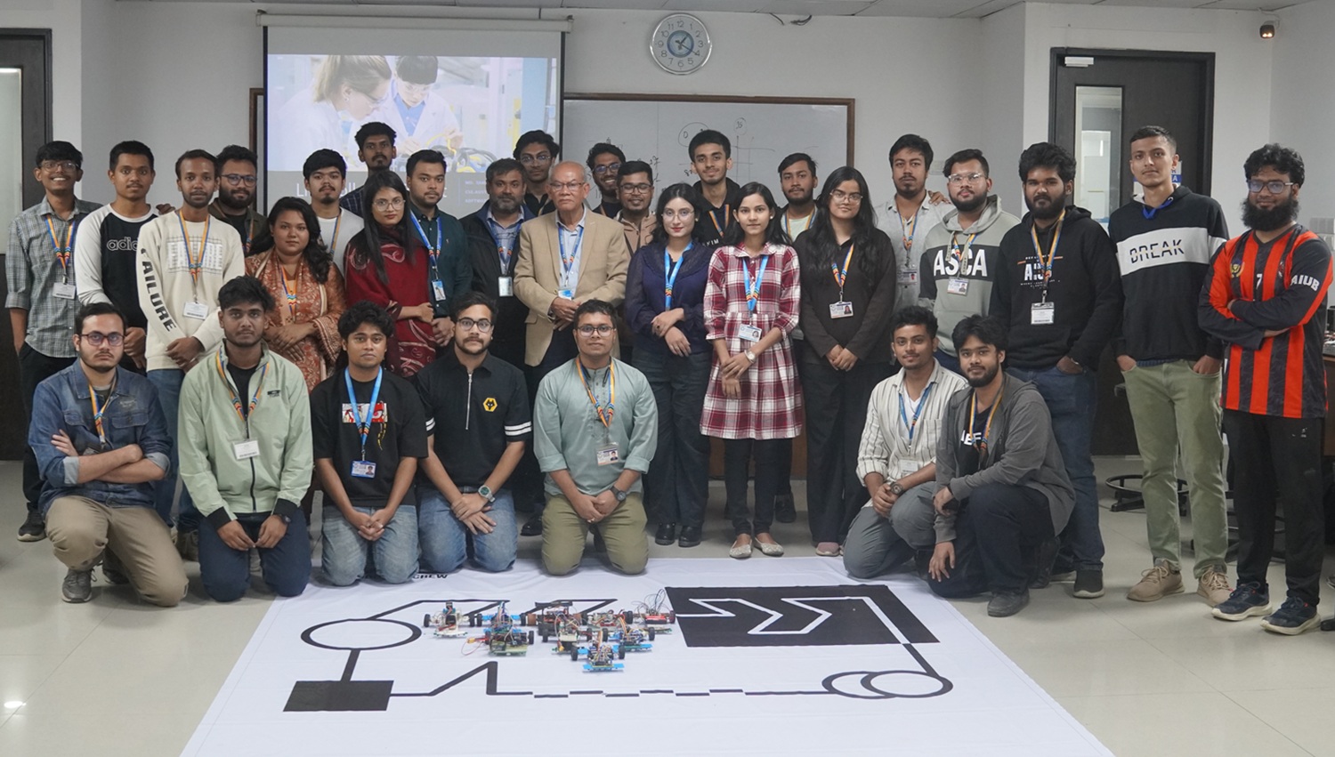 The program formally commenced with an opening address delivered by Dr. Ebad Zahir, Associate Professor, Dept. of EEE, AIUB, marking the inauguration of the workshop. After that, the technical sessions of the workshop were conducted by Mr. Md. Tamzidul Islam, Software Engineer, B2GSoft. He guided the participants through the fundamental principles of line-following robots and shared practical insights related to robot design, programming, and performance optimization. The event was supervised by Mr. Sadman Shahriar Alam, Assistant Professor, Dept. of EEE to ensure smooth execution. Finally, Prof. Dr. ABM Siddique Hossain, Dean, Faculty of Engineering, AIUB, concluded the workshop and presented a plaque of appreciation to the guest instructor in recognition of his contribution.