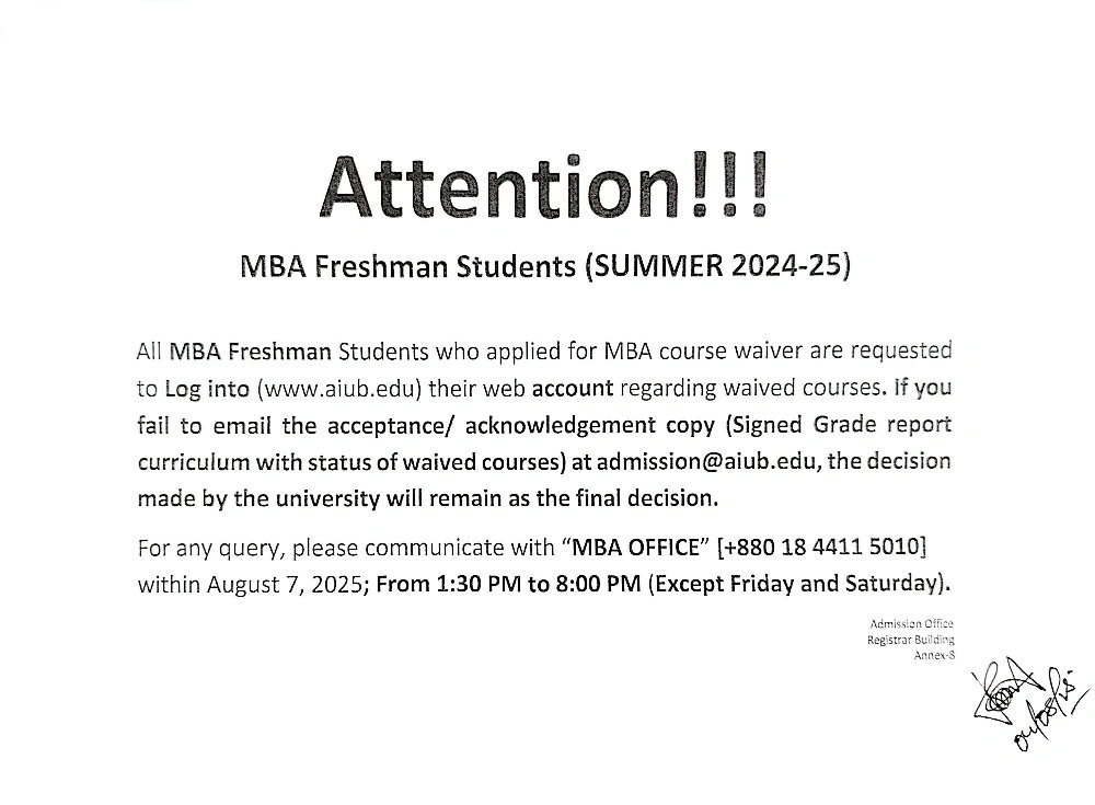 MBA Freshman Students of Summer 2024-25 (Regarding Waived Courses)