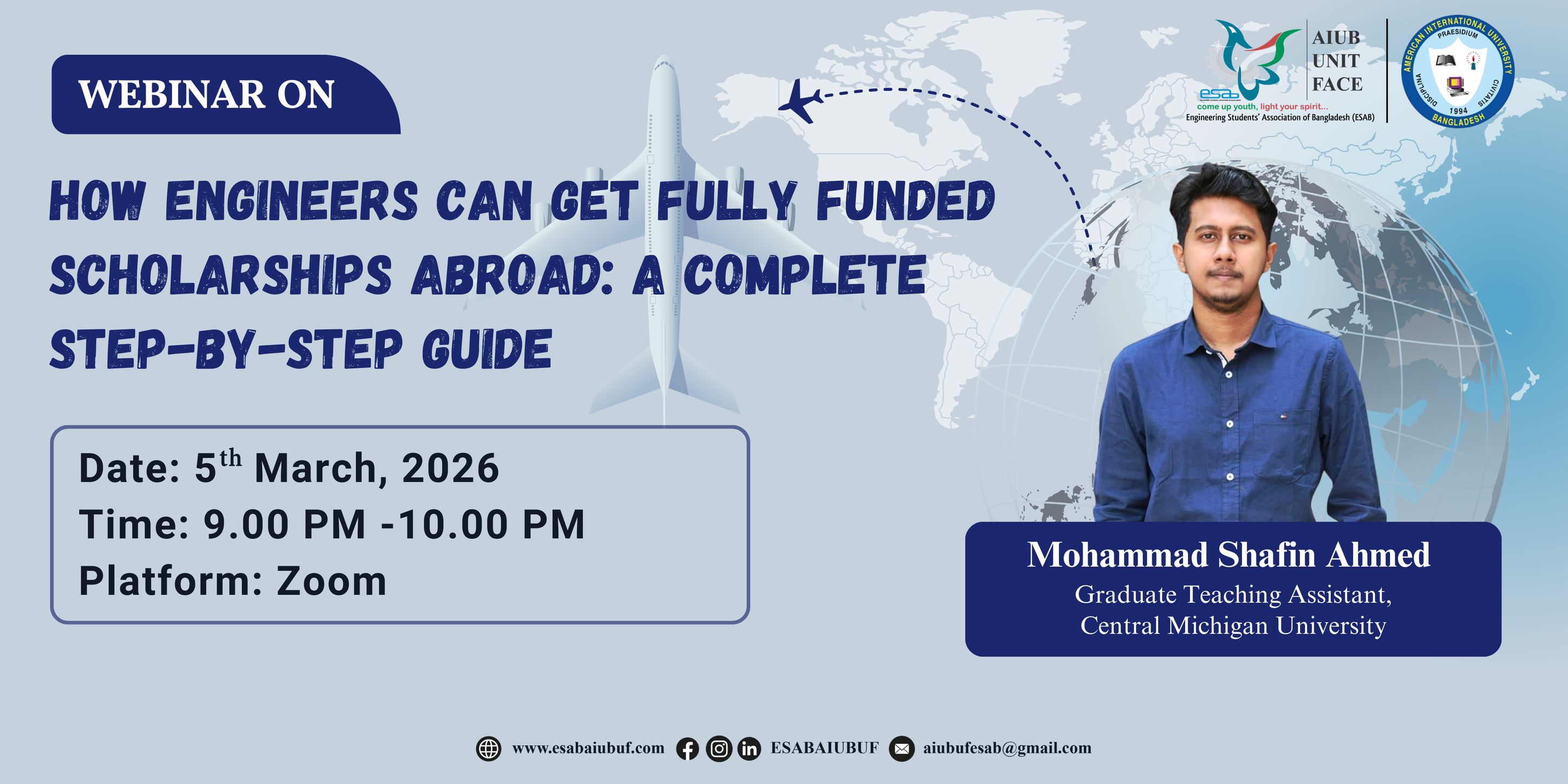 On Thursday, March 5, 2026, the Engineering Students’ Association of Bangladesh (ESAB)-AIUB Unit Face organized a webinar titled “How Engineers Can Get Fully Funded Scholarships Abroad: A Complete Step-by-Step Guide” via Zoom. The event aimed at providing engineering students with comprehensive guidance on pursuing higher studies abroad through fully funded scholarship opportunities.